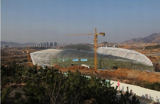 2014年青島世界園藝博覽會(huì)場區(qū)位于青島市北部百果山森林公園,由植物館、主題館、夢幻科技館等10余個(gè)場館組成。地下1層為鋼筋混凝土框架剪力墻結(jié)構(gòu),地上1層為鋼結(jié)構(gòu),整體呈樹葉形,總建筑面積達(dá)2.3萬平方米,是亞洲最大的鋼結(jié)構(gòu)植物園。