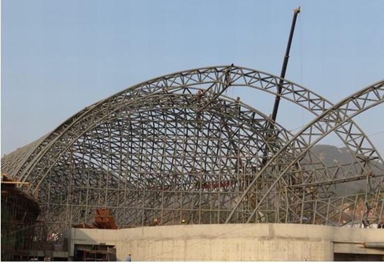 植物園鋼結(jié)構(gòu)采用空間網(wǎng)格結(jié)構(gòu)體系,主要受力構(gòu)件為拱形倒三角管桁架,桁架之間采用單層網(wǎng)殼及次桁架連接,從而形成一個(gè)穩(wěn)定的空間結(jié)構(gòu)受力體系。鋼結(jié)構(gòu)輪廓長度193m,寬度118m,主桁架最大跨度近70m。構(gòu)件均采用圓管截面,桿件之間通過相貫焊縫連接在一起。主桁架均為落地桁架,桁架端部柱腳與混凝土之間用鉸支座連接,保證了結(jié)構(gòu)受力的可靠性與穩(wěn)定性。
